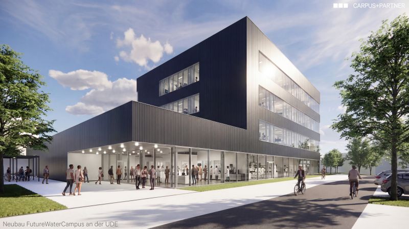 Die Universität Duisburg-Essen erhält ein neues Zentrum für ihre international anerkannte Wasserforschung, den FutureWaterCampus. Dieser Campus ist als Ort inter- und transdisziplinärer Zusammenarbeit konzipiert. In biologischen und chemischen Laboren arbeiten Natur-, Ingenieur- und Gesellschaftswissenschaften gemeinsam mit Praxispartnern an nachhaltigen Lösungen für globale Herausforderungen. Geplant sind unter anderem eine Versuchshalle für großtechnische Anlagen, die den Transfer von Forschungsergebnissen vom Labor in den Pilotmaßstab ermöglicht, sowie eine Denkfabrik und ein Wissenshub zur Stärkung von Vernetzung und Weiterbildung.
