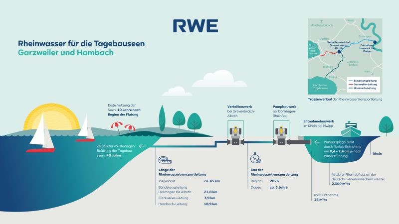 Die Bezirksregierung Arnsberg (Nordrhein-Westfalen) hat den beantragten Rahmenbetriebsplan für den Bau und Betrieb der Rheinwassertransportleitung zugelassen. Damit kann RWE nun mit dem Bau der rund 45 Kilometer langen Trasse vom Rhein bei Dormagen zu den Tagebauen Hambach und Garzweiler beginnen. Die Leitung ist eine wesentliche Voraussetzung für die umfassende Rekultivierung und Wiedernutzbarmachung der Tagebaue im Rheinischen Revier. Der Baustart für die Rheinwassertransportleitung erfolgt Anfang März 2026. Die Rheinwassertransportleitung trägt maßgeblich dazu bei, die zukünftigen Tagebauseen Hambach und Garzweiler mit Rheinwasser zu befüllen, Feuchtgebiete im Naturpark Schwalm-Nette zu sichern und den Grundwasserhaushalt der Region zu stabilisieren. Die Fertigstellung der Rheinwassertransportleitung ist für das Jahr 2030 vorgesehen. Anschließend beginnt die Befüllung des Tagebausees Hambach und ab dem Jahr 2036 die des Tagebausees Garzweiler. Der Tagebausee Inden wird ab 2030 mit Wasser aus der nahen Rur befüllt.